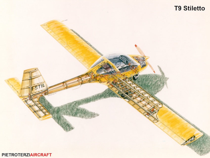The T9 aerodynamic design represents the state of the art in respect to the speed flight envelope of this type of plane. The aerodynamic efficiency is shown in particular in the shape of the fuselage, in the adoption of Wortmann profiles, in the high aspect ratio of the horizontal surfaces and in the adoption of a horizontal, one piece, all-moving tailplane.